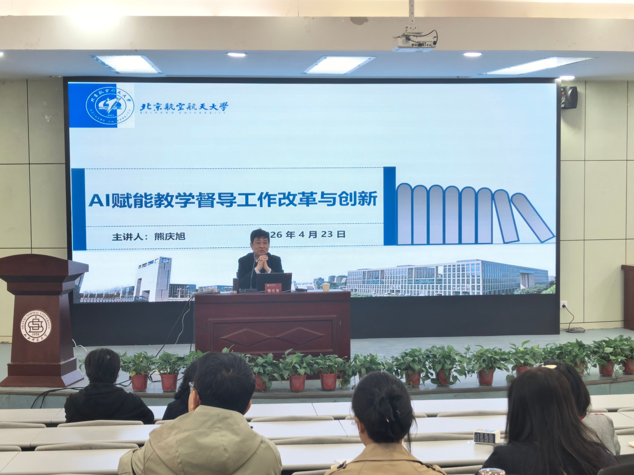 4月23日,我中心邀请北京航空航天大学熊庆旭教授,在图书馆一楼报告厅作了题为《AI赋能教学督导工作改革与创新》的专题讲座。讲座由中心主任李跃飞主持。